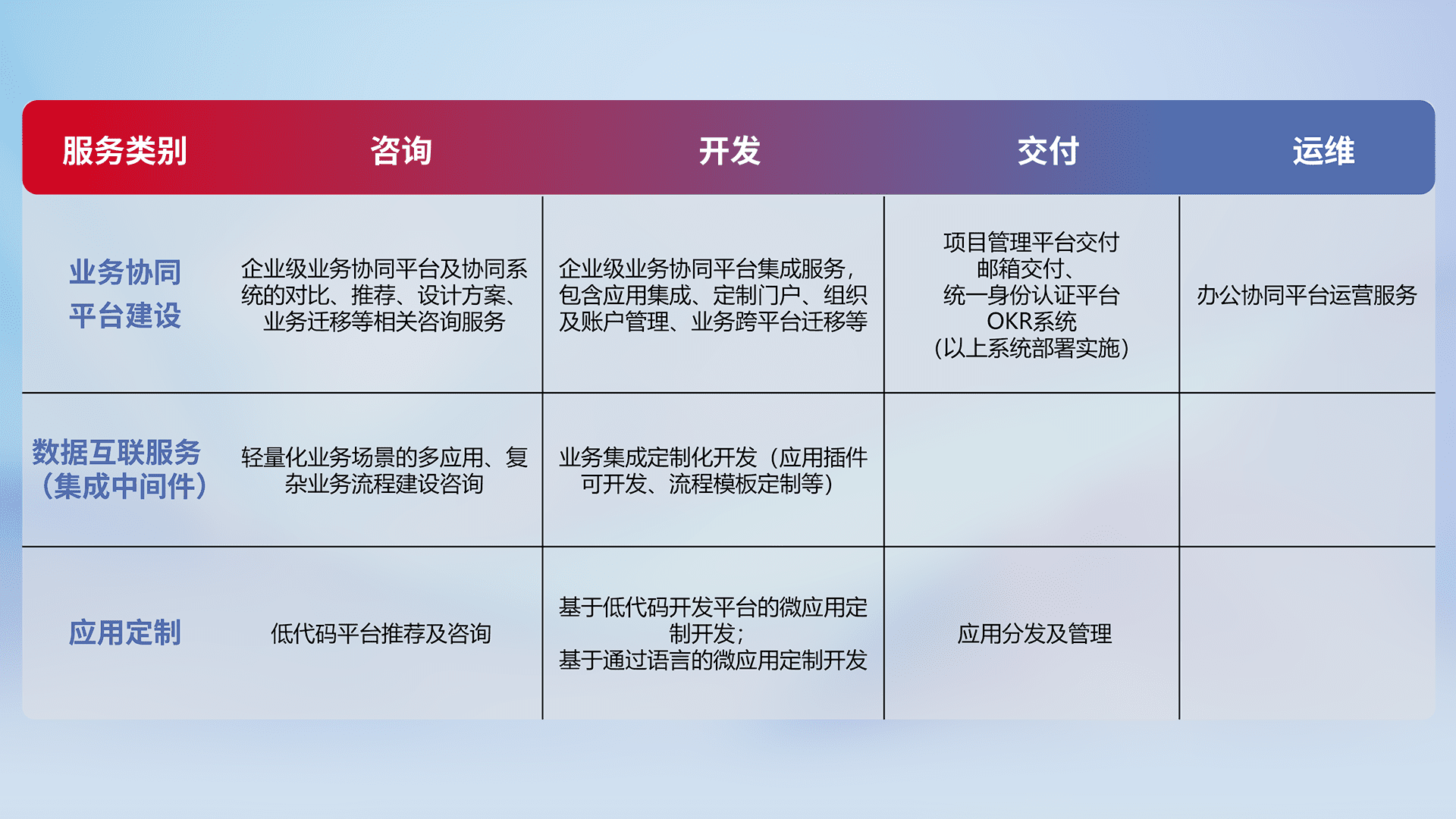 针对钉钉、、企微、、IDaas等平台级产品提供产品的规划、、、、方案、、、交付、、、、定制化开发等服务,,实现如统一协同办公、、、智能客户服务、、、混合会议管理、、、、智能数据查询、、等业务场景,,,实现数字化转型。。。。
